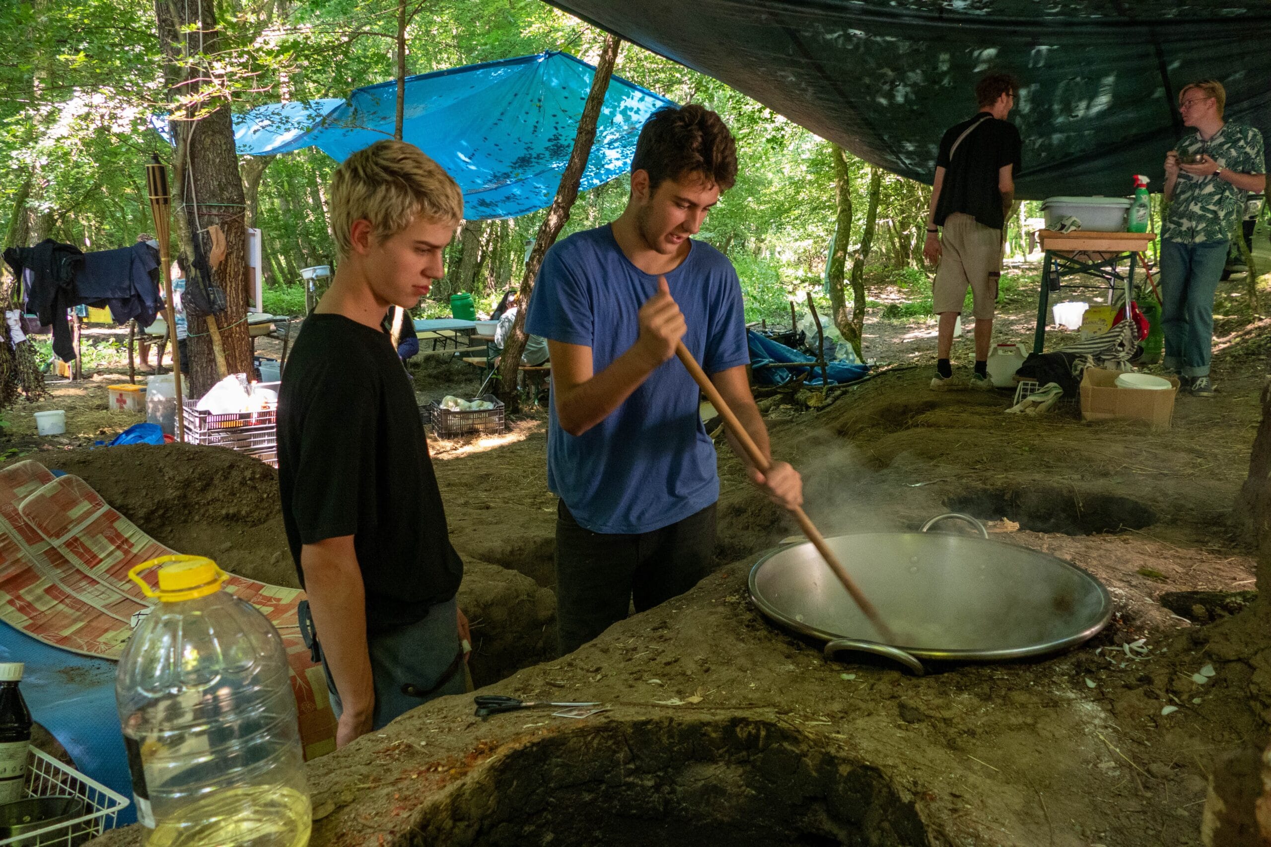 A tábor szempontjából az egyik legalapvetőbb objektum a konyha. Itt készül 10 napon át a napi háromszori meleg étel, valamint a hideg tízórai és uzsonna, 130 (azaz százharminc!) fő részére. Ennek megfelelően a képen látható „zárt égésterű”, magas hatékonyságú (értsd: ne kelljen olyan sok fát gyűjteni 100 liter víz felforralásához) bronzkori tűzhelyeket alakítunk ki.