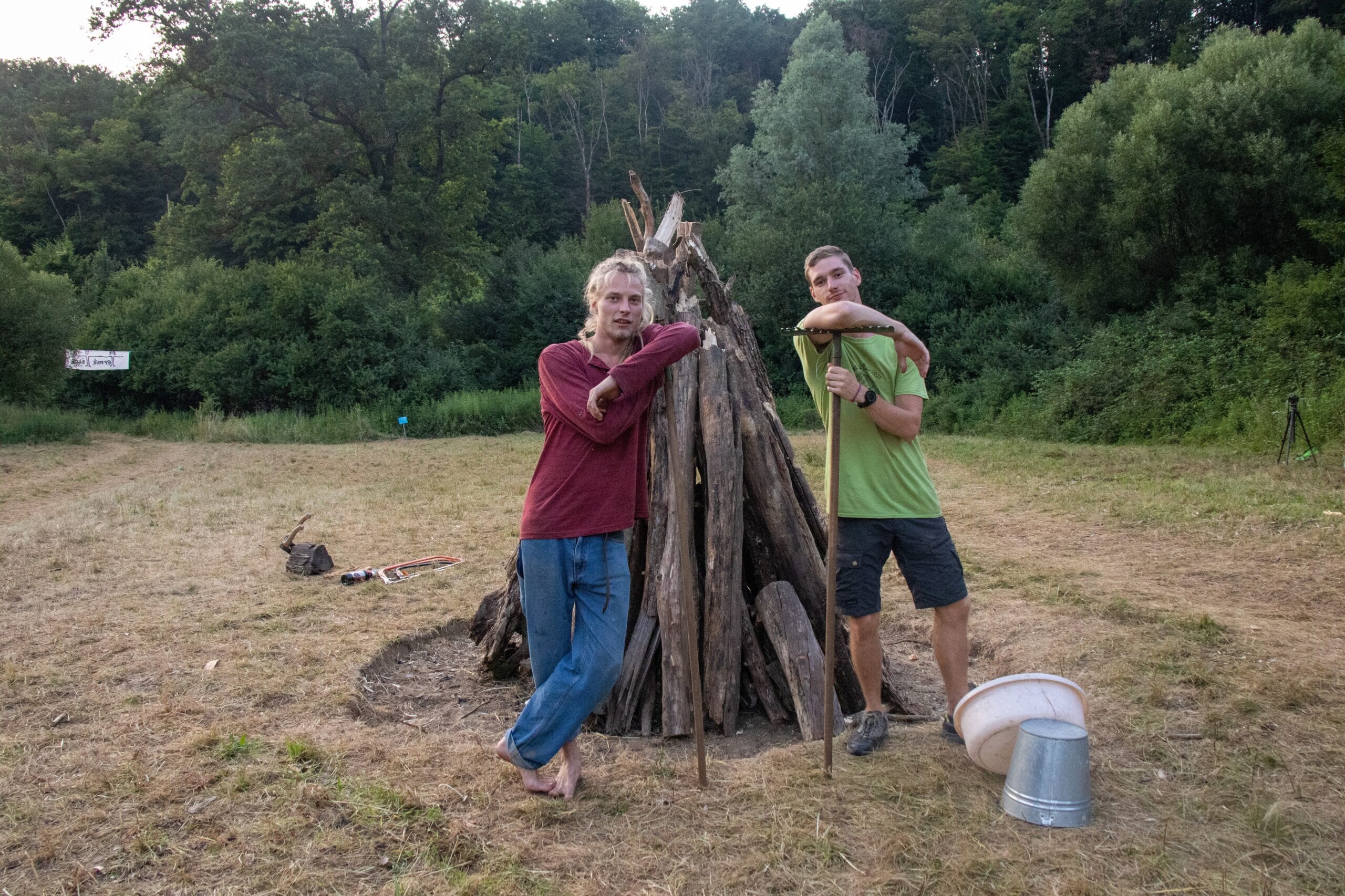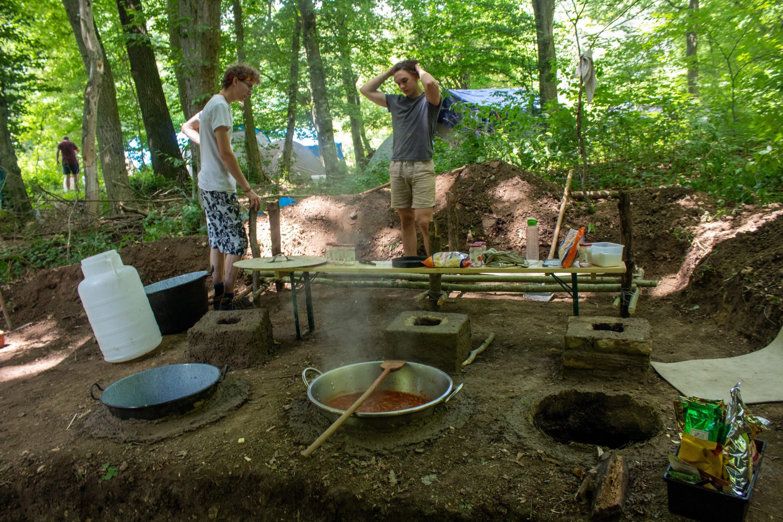 A tűzhely kialakítása a táborépítés alatt az egyik legkeményebb munka, mely komoly szaktekintélyek vezetésével folyik (legalábbis mi úgy tekintünk rájuk). Az építés nem kis rizikót hordoz magában, hiszen ha például az égéstér és a kémény közötti földalatti áttörés valamilyen okból kifolyólag nem megvalósítható (mondjuk azért, mert egy húsz kilós kő az utunkba kerül, vagy mert egy tölgy hatvan éve oda vert gyökeret), akkor az árokásó srácok kezdhetik újra a munkát fél méterrel odébb. És ugye szégyenbe meg nem eshetünk, hogy a táborozók érkezésének délutánjára ne tudjunk meleg ételt felszolgálni :)…